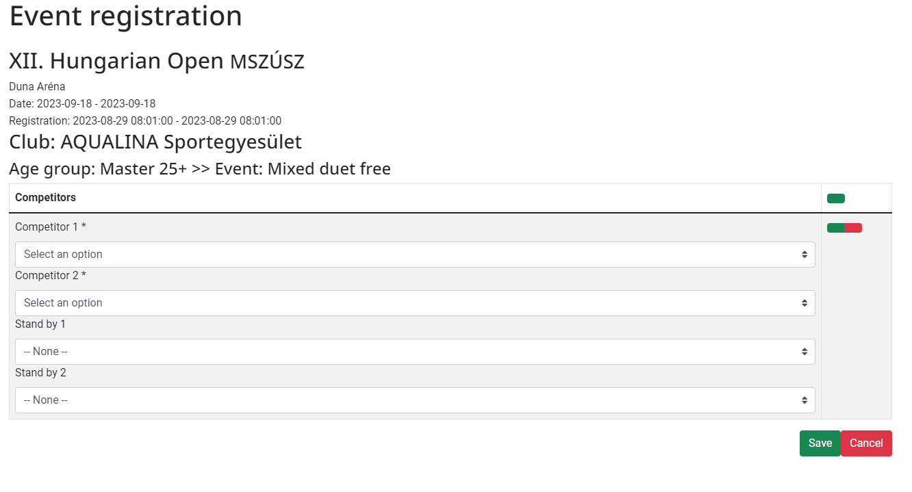 A versenyszám kiválasztását követően megjelenik a versenyszámon indítható versenyzők vagy több versenyző esetén a versenyzői csoportok lehetséges listája. (a lehetséges versenyzők és tartalék versenyzők száma a versenyszám szerint változik).